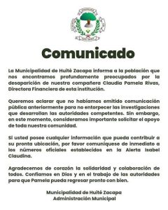 La municipalidad de Huité también ha emitido un comunicado solicitando la colaboración de la población para encontrar a su trabajadora y ha señalado que no publicará más detalles para no entorpecer la investigación.